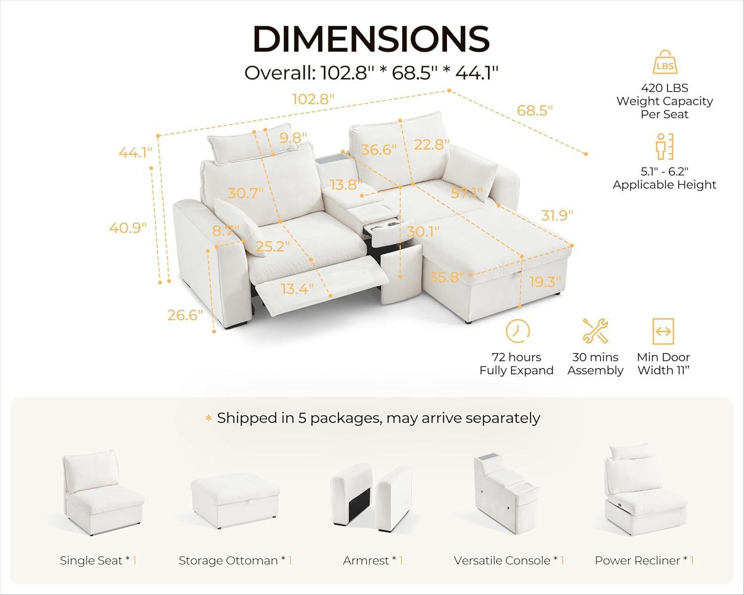 The 102.8-inch White Chenille Power Recliner Sofa brings hotel-caliber comfort into your living room with a thoughtful, space-smart design. Enjoy cloud-soft seating, adjustable support, and built-in convenience that adapts to your day—from quiet movie nights to lively gatherings.