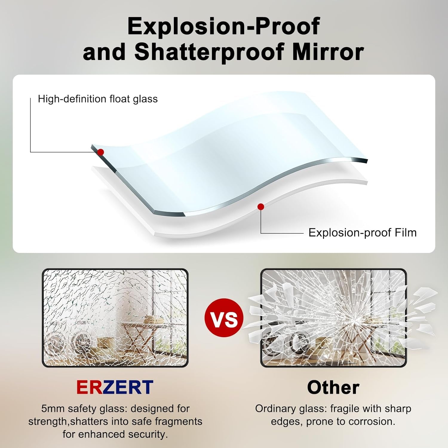 - High-definition float glass with 5mm safety glass and a safety film for a clear, distortion-free reflection and secure use.