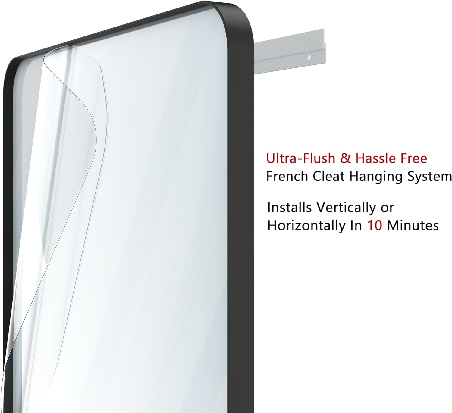 - Ultra-Flush Z-bracket Hanging System with durable hardware for secure, effortless vertical or horizontal installation in under 10 minutes; French mounting brackets included for simple setup.