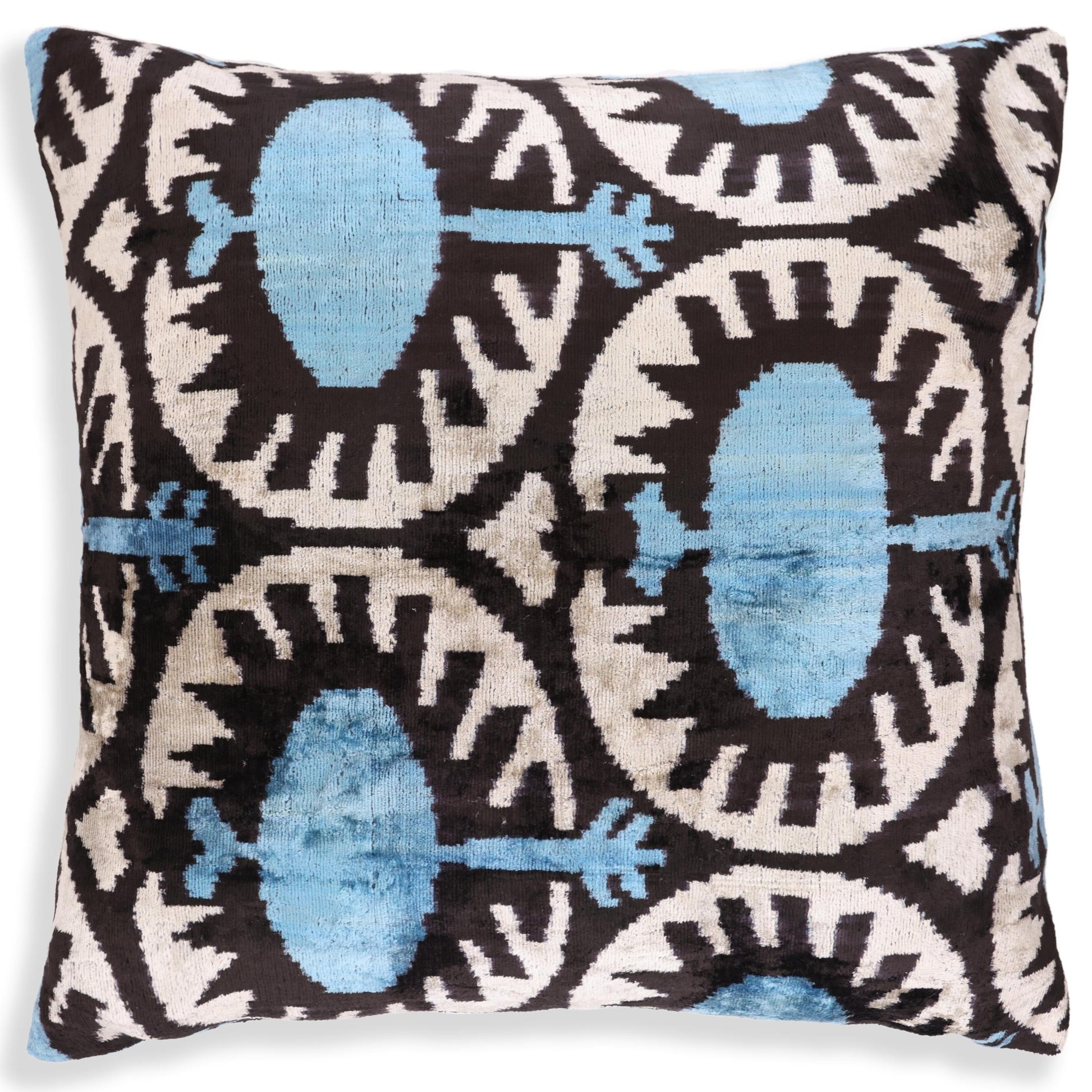 Blue Black Geometric Silk Velvet Pillow – 20x20 Handmade Ikat Throw Cushion
