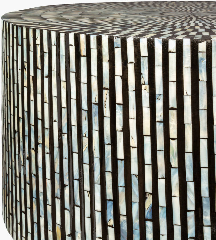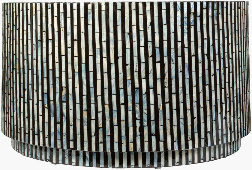 Transform your living space into a gallery of elegance with the Enontekio Black Coffee Table. Handcrafted in Vietnam, this exquisite piece showcases a captivating mosaic of black and white shell inlay, punctuated with shimmering blue shell accents for a truly unique and artistic finish. The round, drum-shaped silhouette offers a modern yet timeless appeal, making it the perfect centerpiece for any contemporary home.
