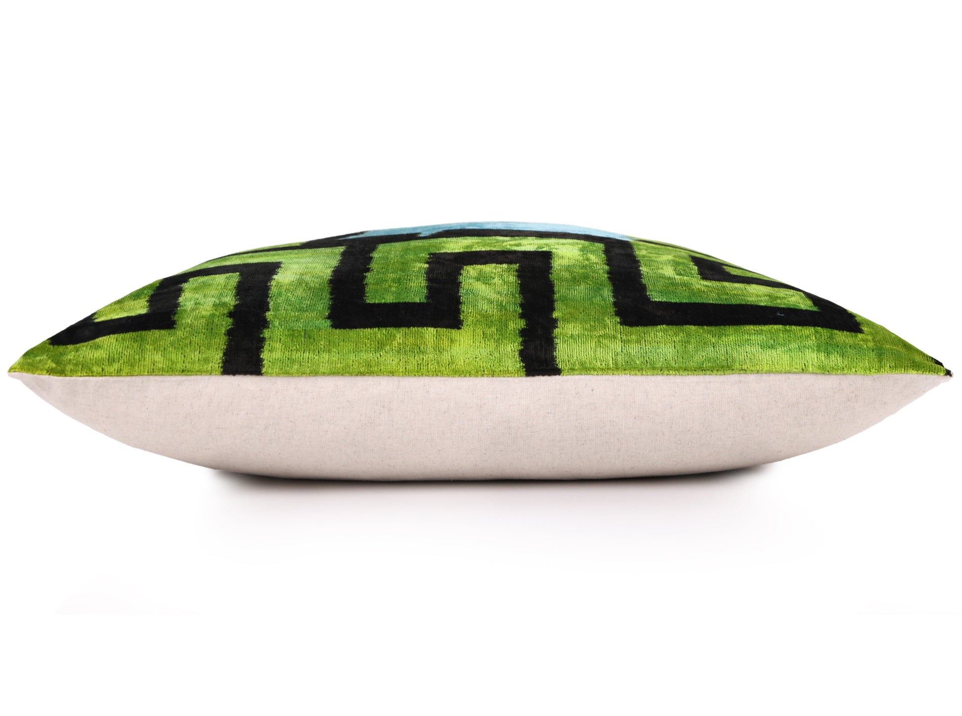 Add architectural elegance to your interior with this handmade artisan silk velvet pillow, featuring a bold Greek key-inspired pattern in vibrant lime green, jet black, and cool sky blue.