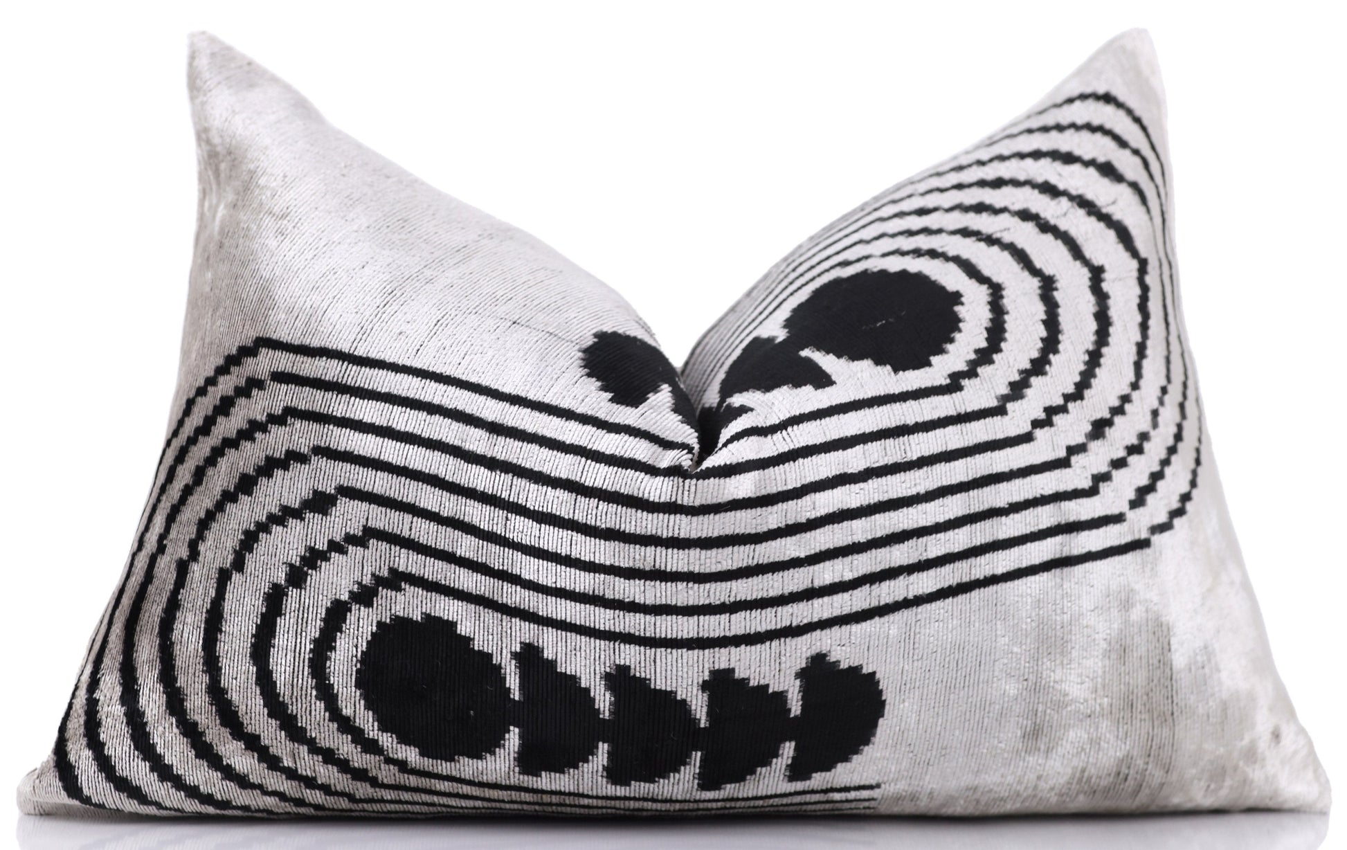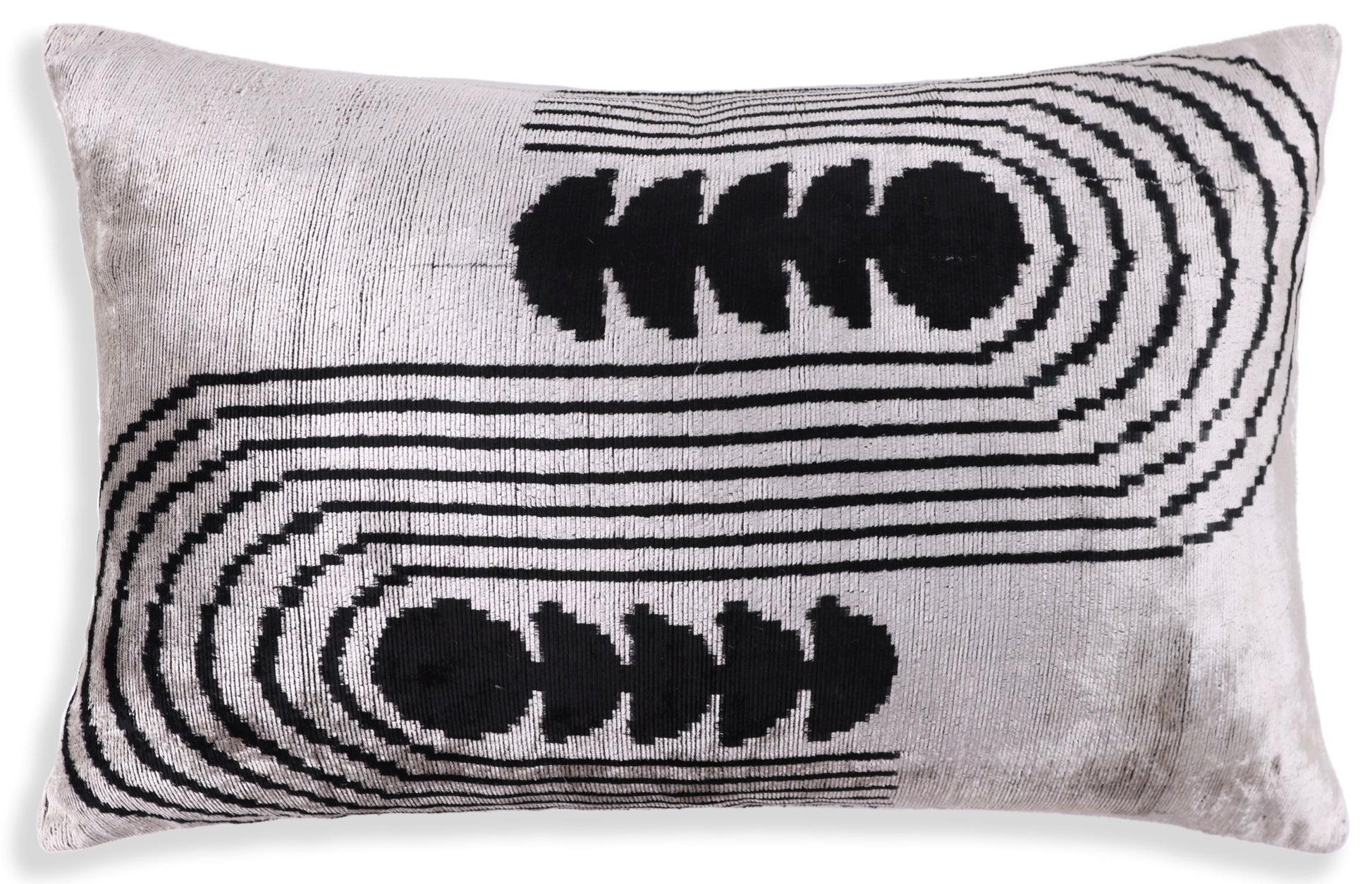 This 16x24 handmade silver and black velvet lumbar pillow strikes the perfect balance between sophistication and bold design. Crafted from handwoven silk velvet, it features a shimmering silver backdrop with striking black geometric patterns, making it a powerful statement piece in any interior. The premium feather insert ensures both comfort and luxury, while the artisanal craftsmanship guarantees uniqueness and quality.