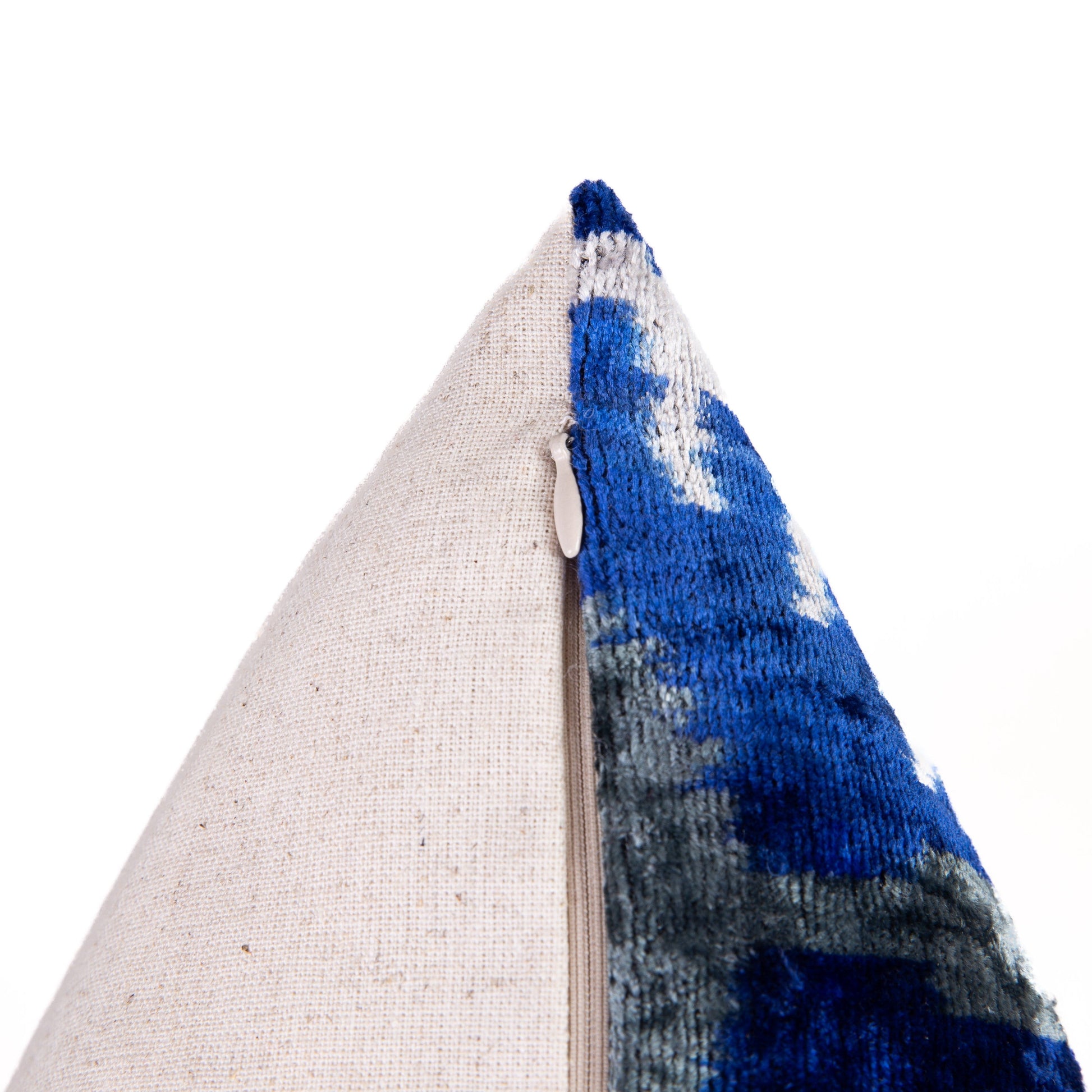 Bring a touch of global-inspired elegance to your home with this stunning handmade velvet throw pillow, expertly crafted using natural vegetable dyes for an organic and authentic look. Featuring a bold ikat pattern in striking shades of blue, gray, and white, this pillow creates an eye-catching statement in any space. Measuring 16x16 inches, it is the perfect size for sofas, chairs, and beds, adding a stylish and cozy touch. The premium down feather insert ensures maximum plushness and comfort. Whether you're decorating a modern, bohemian, or eclectic-inspired space, this pillow seamlessly integrates into any setting. Crafted with luxurious silk velvet fabric, it combines elegance and durability, making it a timeless addition to your home decor collection.