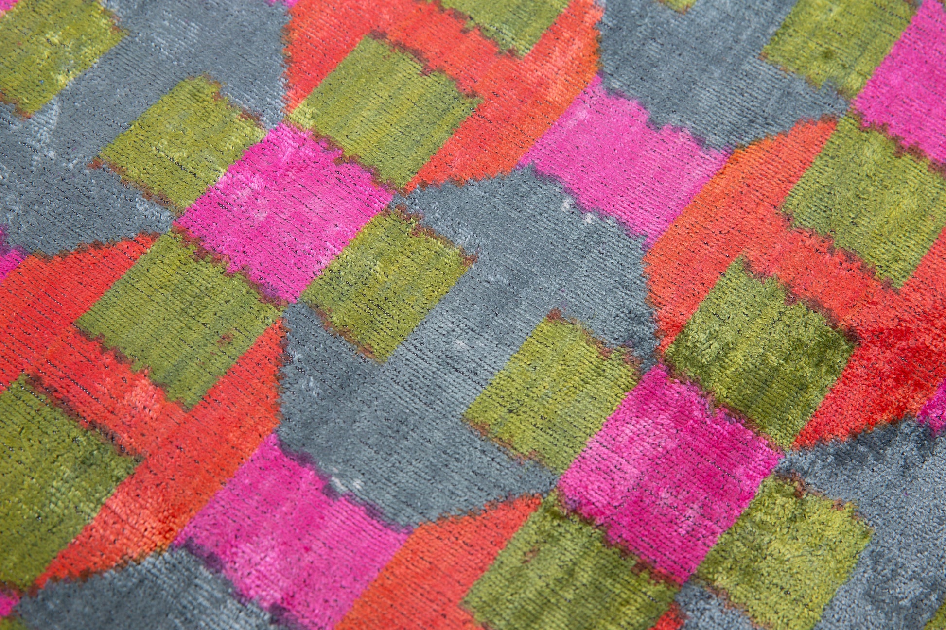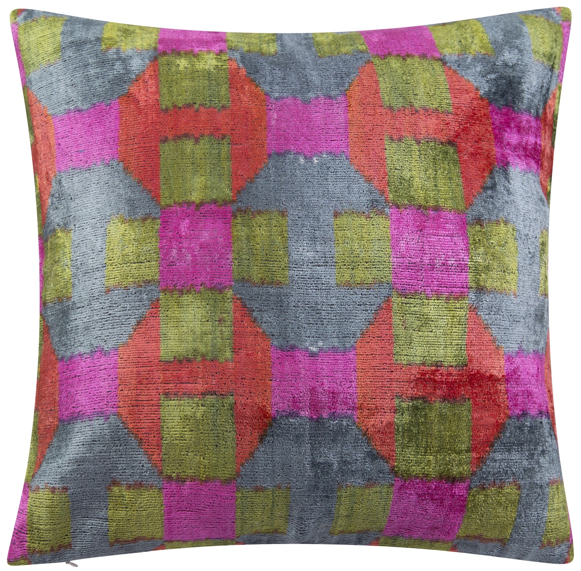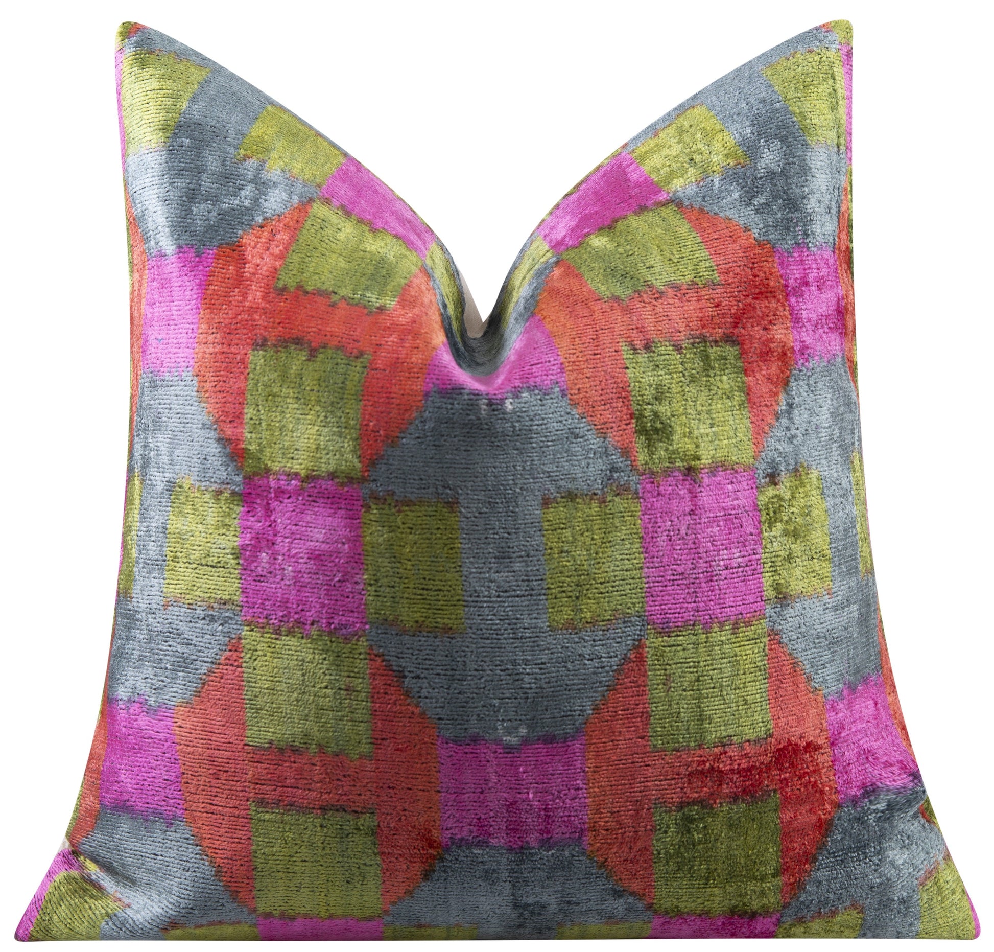 Add a lively and artistic touch to your home decor with this exquisite handmade velvet throw pillow, crafted using natural vegetable dyes for an organic and authentic look. Showcasing a bold geometric checkered pattern in striking shades of pink, green, red, and gray, this pillow creates a dynamic and sophisticated aesthetic. Measuring 16x16 inches, it is the perfect size for sofas, chairs, and beds, bringing a stylish and cozy vibe to any space. The premium down feather insert ensures superior plushness and comfort. Whether you're decorating a modern, bohemian, or eclectic-inspired interior, this pillow seamlessly blends into any setting. Made with luxurious silk velvet fabric, it combines elegance and durability, making it a timeless addition to your home decor collection.