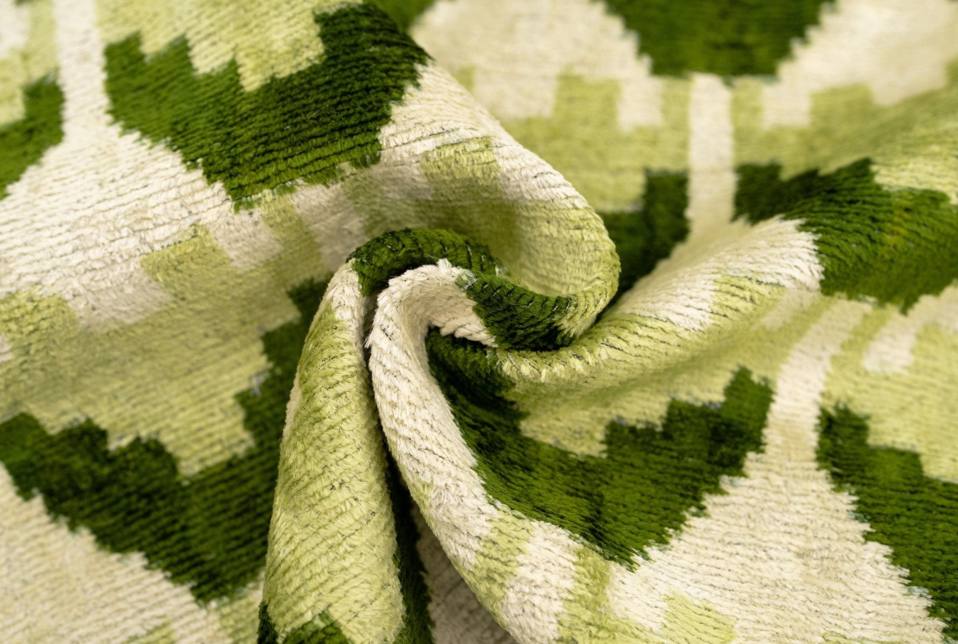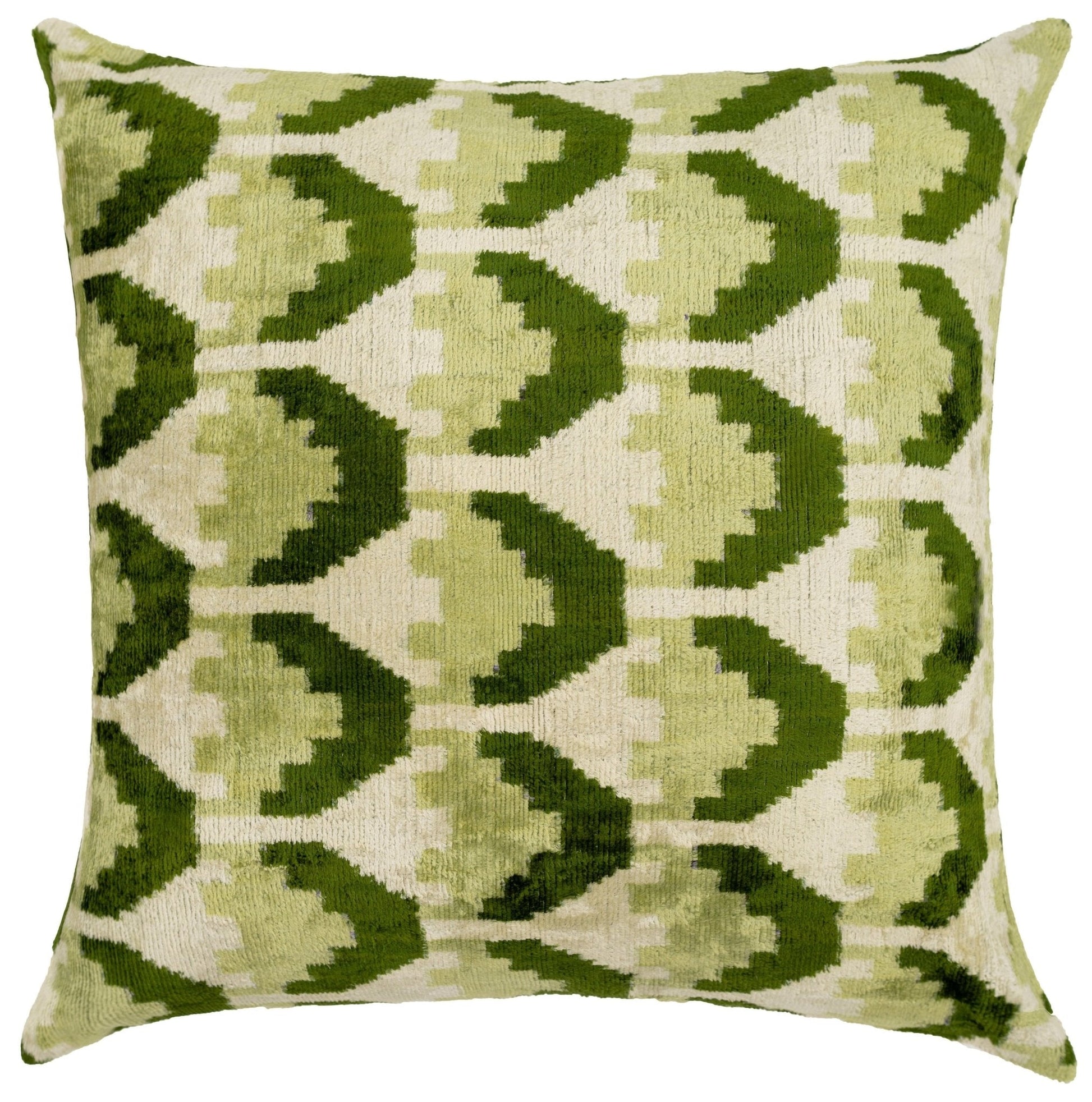 Crafted from high-quality, vegetable-dyed velvet, this pillow is eco-friendly and meticulously handmade, ensuring a soft, durable finish that stands the test of time. The geometric pattern, with its rich green hues and cream accents, creates a visually appealing design that complements a variety of interior styles, from modern and minimalist to eclectic and contemporary.