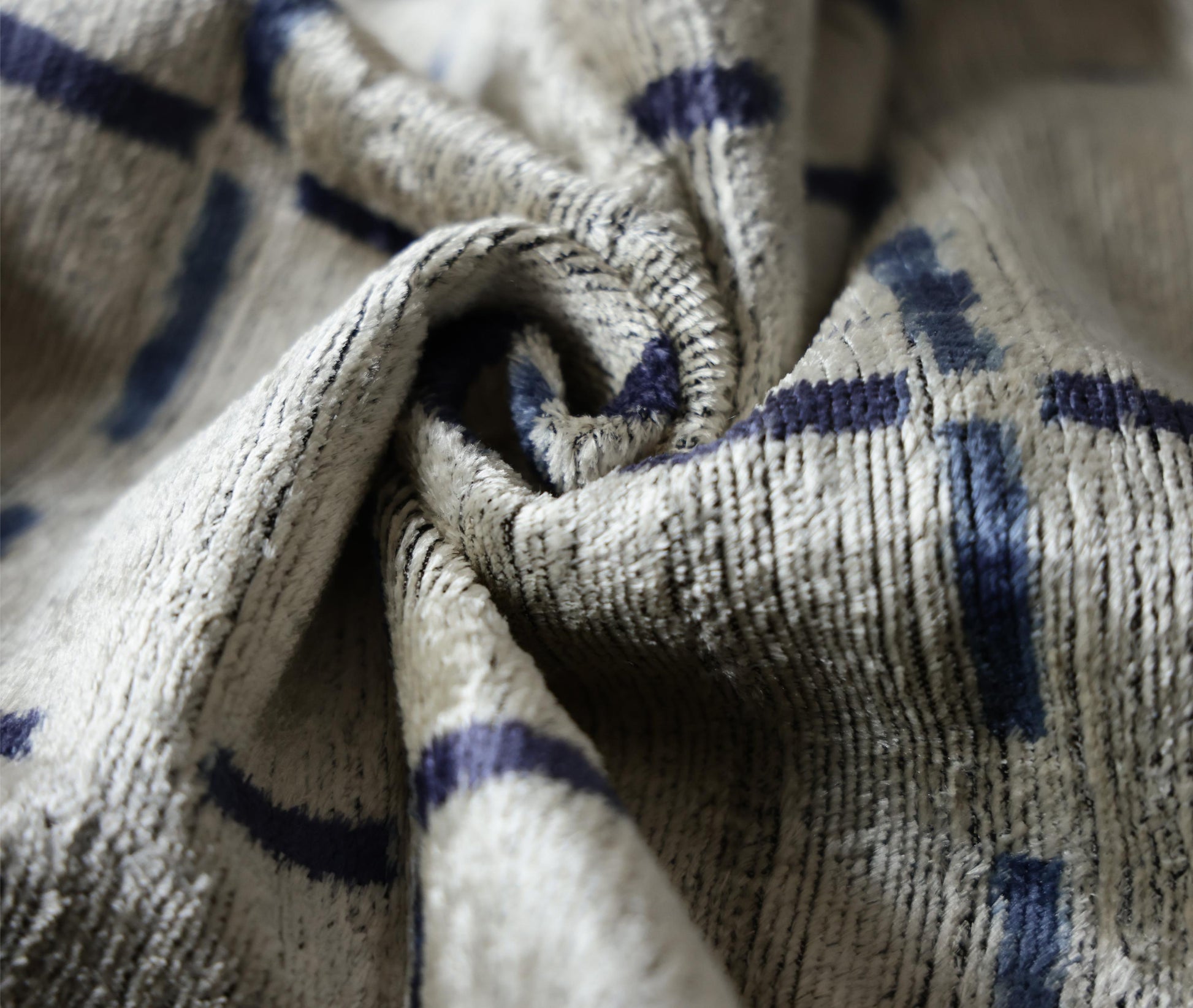 This 20x20 inch handcrafted silk velvet pillow is a refined statement piece designed for elevated interiors. Handwoven and hand-knotted by master artisans using organic, vegetable-dyed silk velvet, this pillow showcases a subtle grid motif in soft ivory with deep indigo accents, creating a timeless balance between structure and softness.