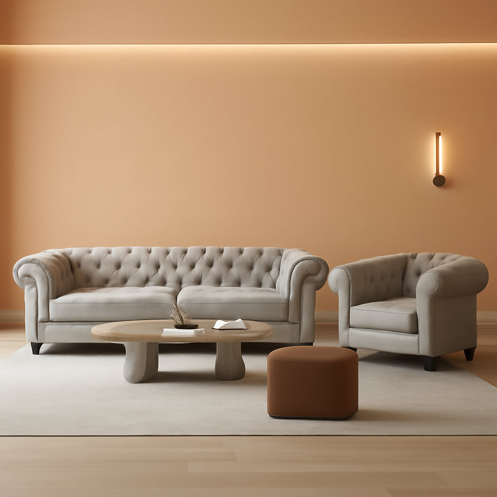 Designed in the classic Chesterfield tradition, this set showcases deep button tufting, nailhead trim, scrolled arms, and turned legs—an elegant nod to timeless craftsmanship that works beautifully in both traditional and contemporary interiors.